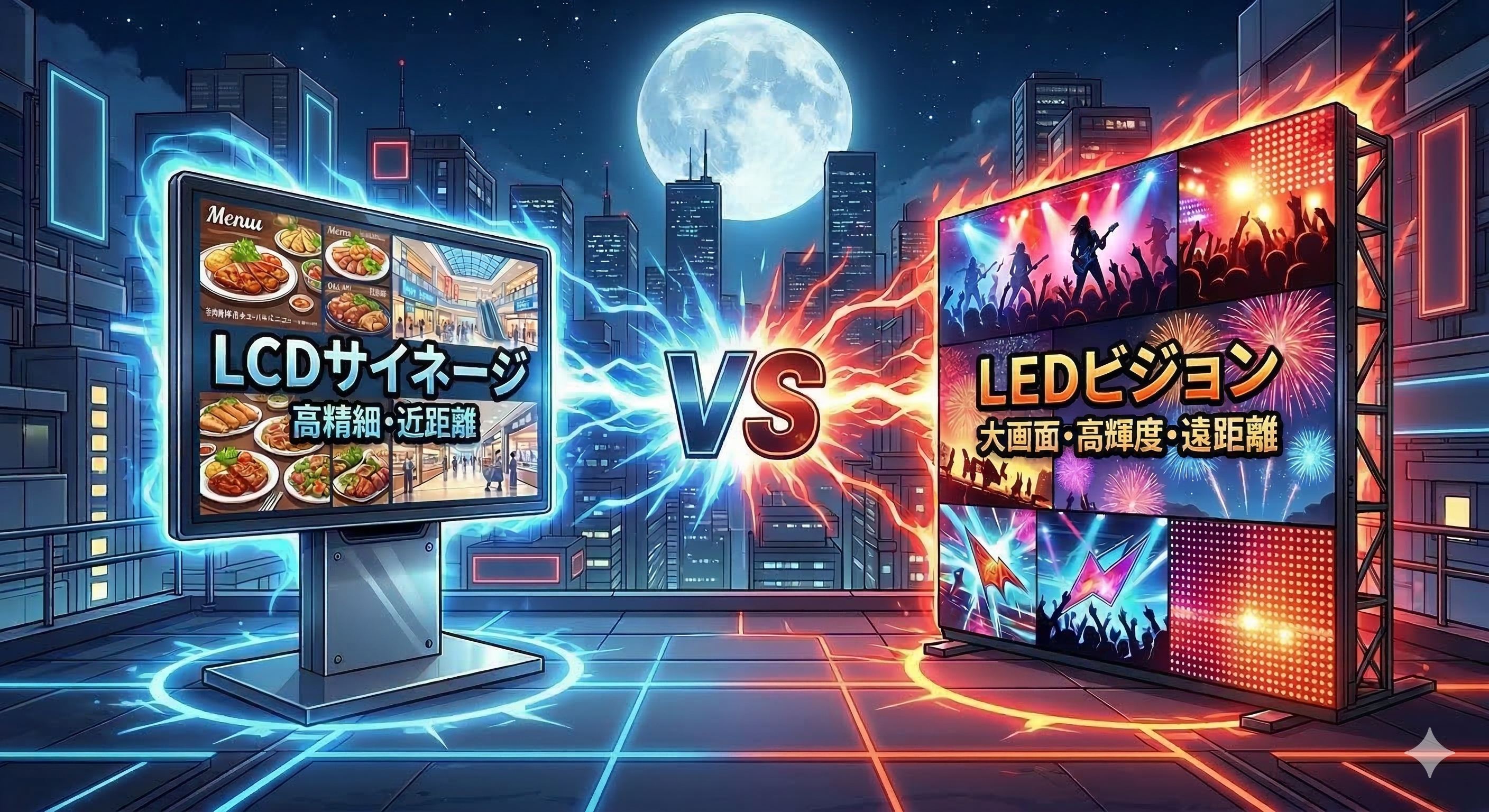 今回、サイネージ選びで最も比較される「屋内用 vs 屋外用」および「液晶ディスプレイ vs LEDビジョン」の違いを、わかりやすい比較表で徹底解説します。集客目的や予算に最適な1台を見つけるための情報源としてご活用ください。
