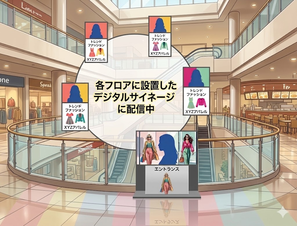 これが商業施設における最大のメリットです。エスカレーター横やエントランスの目立つサイネージ枠を、「自店舗のPR動画を流しませんか?」とテナントへ月額数万円で販売(メディア化)することで、サイネージ自体が利益を生み出す広告媒体へと進化します。