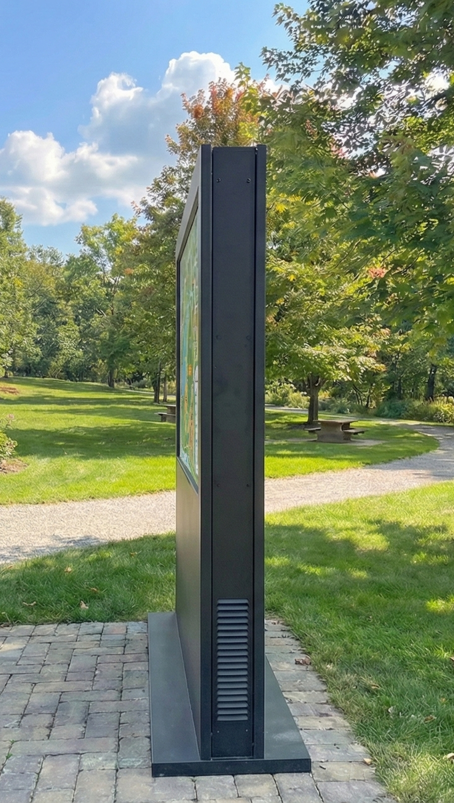 防水防塵・エアコン内蔵の屋外用(IP65)。3000cdの高輝度ディスプレイ搭載、タッチパネル機能付き、USBメモリを挿すだけで静止画/動画の放映が可能です。※HDMIによる映像入力にも対応しています。