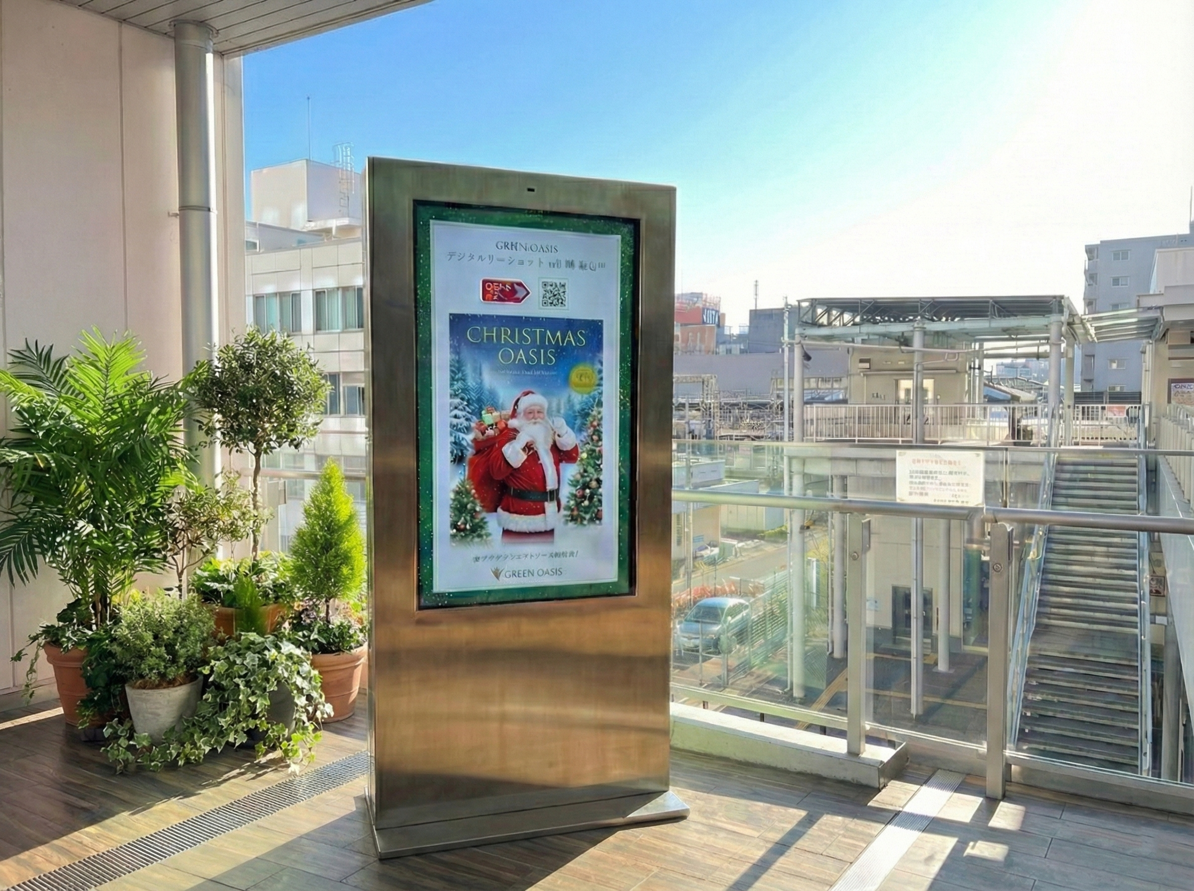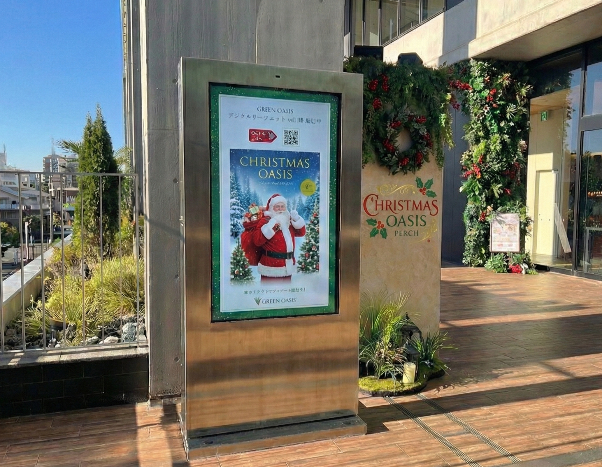 神奈川県〇〇商業施設様では、3か所に設置されていた看板をデジタルサイネージへ更新しました。筐体は周囲の環境に調和するステンレス製を採用しています。背面の作業スペースが限られているため、メンテナンス性を重視し、お客様のご要望に沿って前開き扉仕様で設計しました。 今回は基礎工事は行わず、コンクリート床面に直接固定しています。また、設置場所ごとに傾斜の程度が異なるため、3か所それぞれで水平調整を行い、機器が安定するようバランスを整えました。 コンテンツ配信にはクラウド配信システムを利用し、広告やフロア案内などのコンテンツを配信しています。