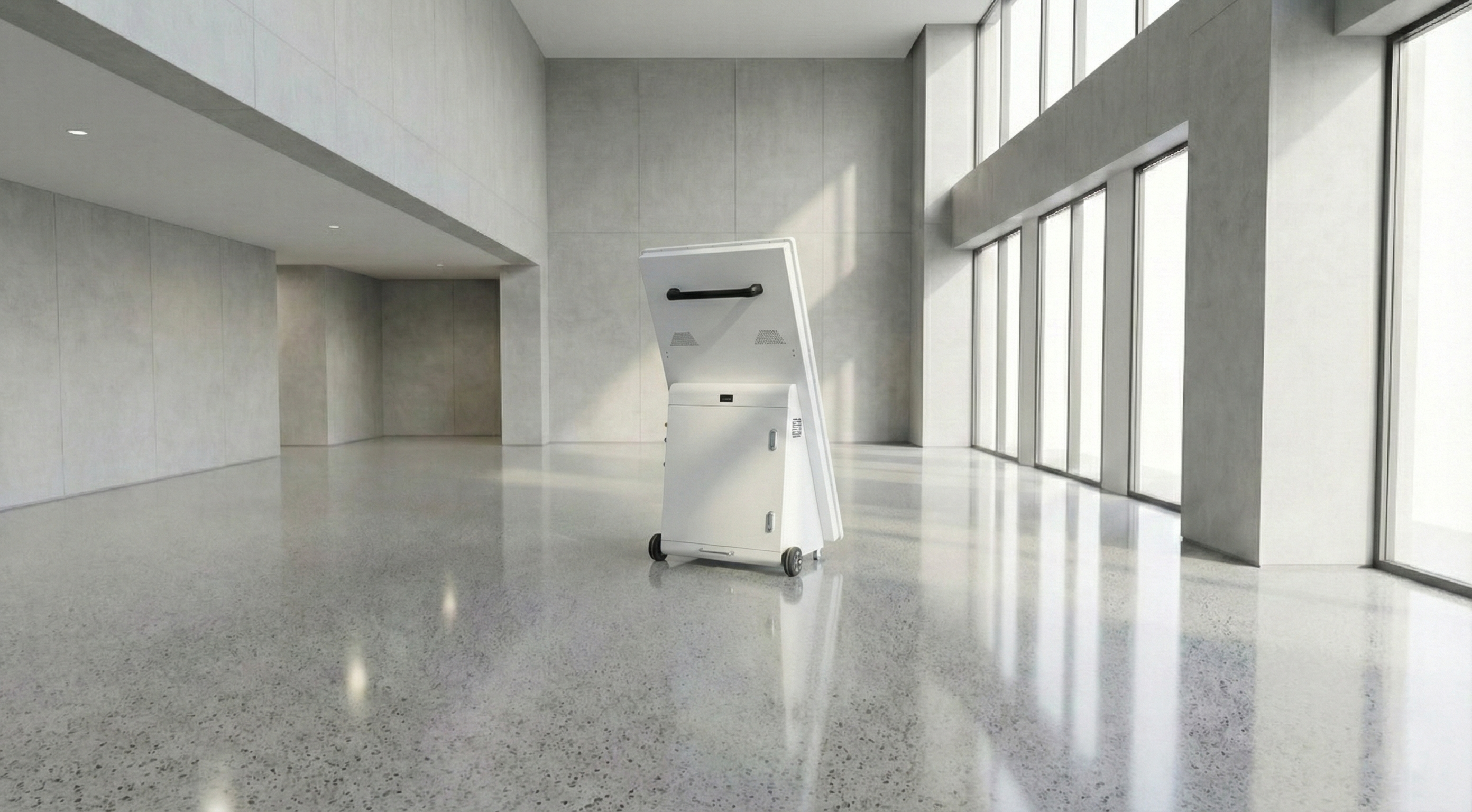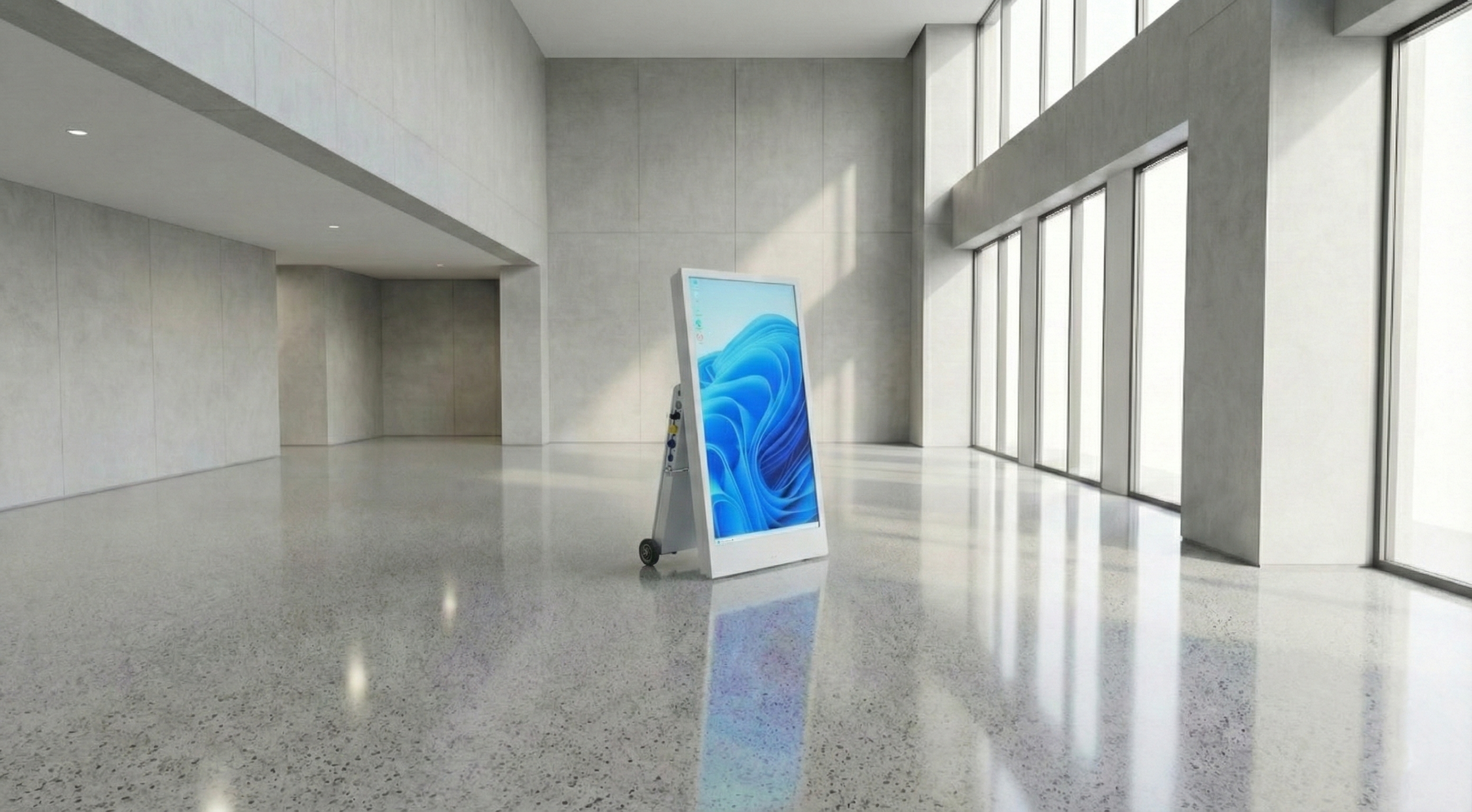 建築現場では、工程や施工手順、注意事項などを作業員へ確実に共有することが求められます。しかし現場は、電源の確保が難しい場所や、紙資料では更新・周知に手間がかかる場面も多く、情報伝達のばらつきや見落としが起きやすいという課題がありました。 そこで、機器を現場へ持ち込み、動画・画像を用いて施工の流れや注意事項を分かりやすく周知し、作業員がいつでも工程を確認できる環境を整える目的でデジタルサイネージを導入しました。 メインボードはAndroid OSからWindows OSへ変更しました。あわせて、側面にUSB端子を備えた外付けの防水ポートを追加しています。移動用キャスター付きのため、持ち運びや移動も容易です。 建築現場などへ持ち込み、施工の流れの説明や、現場作業員がいつでも工程を確認できる環境づくりに活用できます。また、施工時の注意事項を動画や画像で再生し、周知する用途にも適しています。 1回の充電で約10時間使用できるため、電源のない場所でも使用可能です。